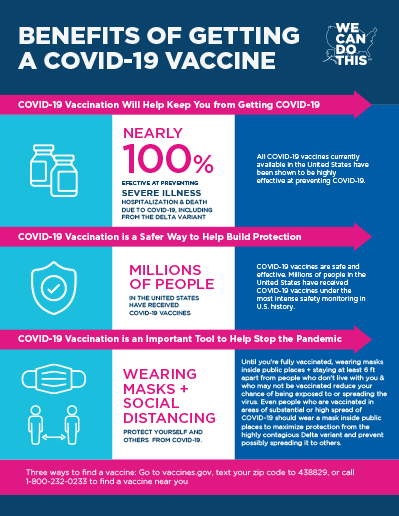 This factsheet provides great information on the benefits of getting the COVID-19 vaccine. It is created by the Department of Health and Human Services (HSS). It can be used to validate peoples’ choice to get the vaccine and help persuade those who are on the fence about getting the vaccine. The intended audience is those outside the government who have a choice whether they should get it or not.